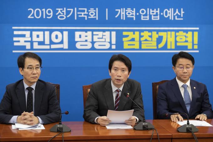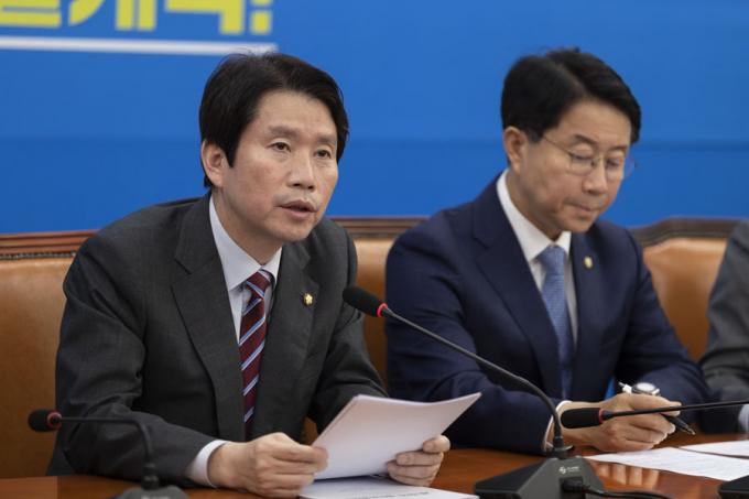 더불어민주당 이인영 원내대표(왼쪽)가 7일 오전 서울 여의도 국회에서 열린 민주당 정책조정회의에 참석해 발언하고 있다.