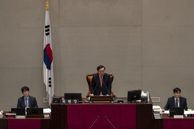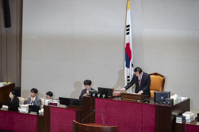 자유한국당 소속 김재원 예산결산특별위원회 위원장이 7일 오전 서울 여의도 국회에서 열린 예결위 종합정책질의 전체회의를 주재하고 있다.