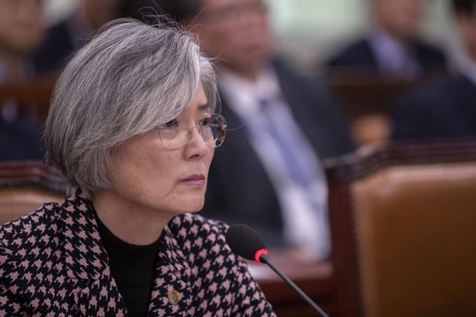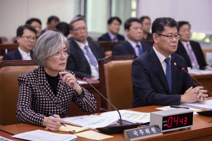 강경화 외교부 장관(왼쪽)이 7일 오후 서울 여의도 국회에서 열린 외교통일위원회 전체회의에 출석해 의원 질의를 듣고 있다.