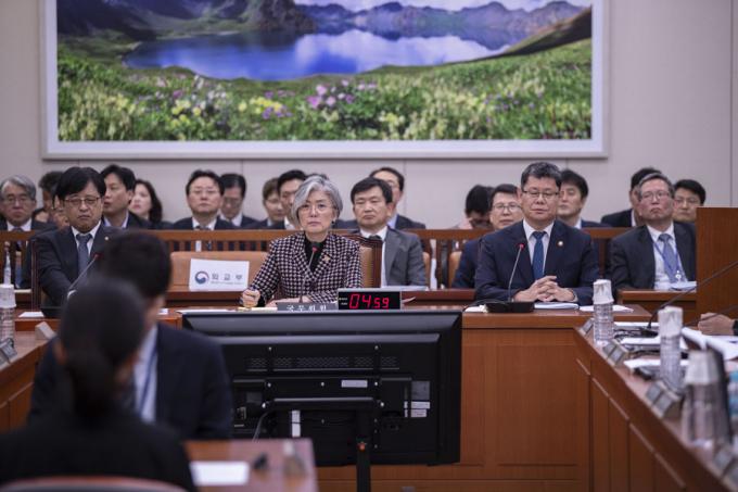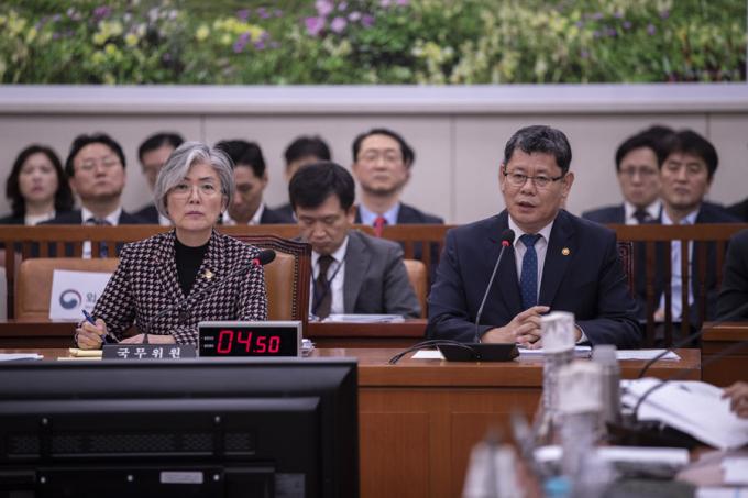 김연철 통일부 장관(오른쪽)이 7일 오후 서울 여의도 국회에서 열린 외교통일위원회 전체회의에 출석해 탈북민 강제송환에 대한 의원 질의에 답하고 있다.
