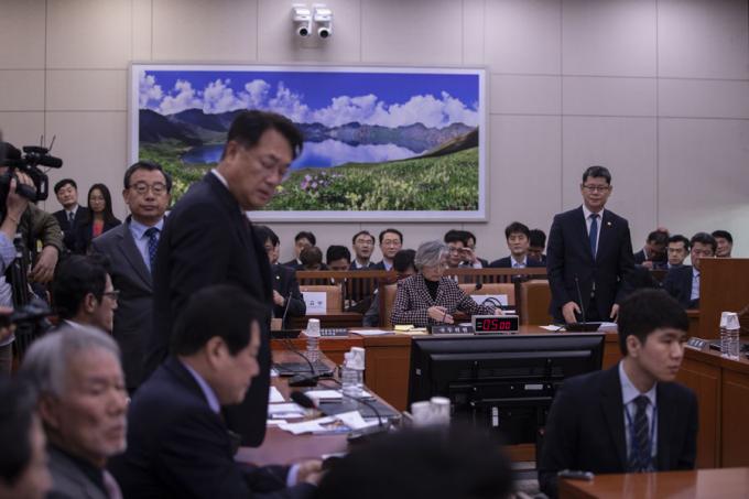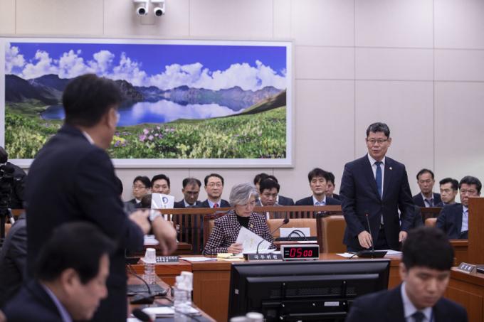 외교통일위원회 전체회의가 7일 오후 서울 여의도 국회에서 열린 가운데 탈북민 강제송환 관련으로 정회되자, 한국당 소속 정진석 위원이 김연철 통일부 장관에게 항의하고 있다.