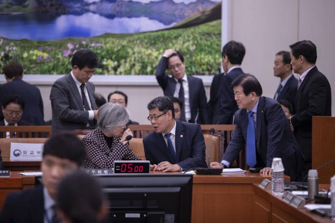 외교통일위원회 전체회의가 7일 오후 서울 여의도 국회에서 열린 가운데 탈북민 강제송환 관련으로 정회되자, 김연철 통일부 장관과 강경화 외교부 장관이 대화를 하고 있다.