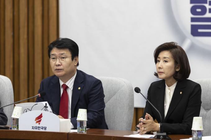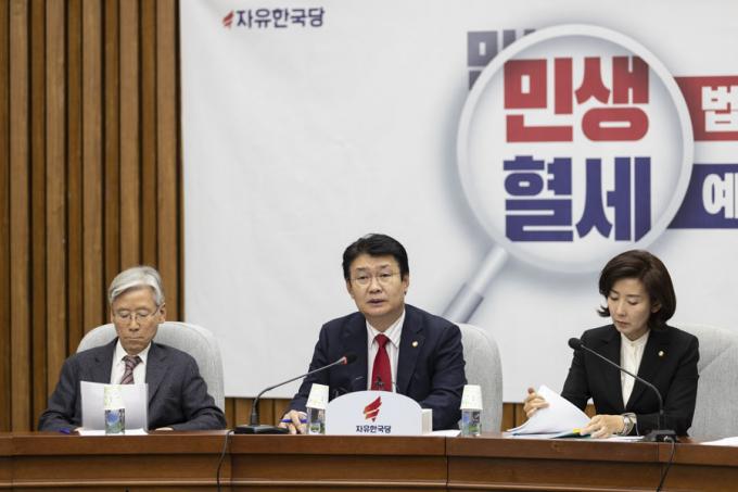 자유한국당 정용기 정책위의장(왼쪽)이 8일 오전 서울 여의도 국회에서 열린 한국당 원내대책회의에 참석해 발언하고 있다.