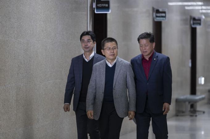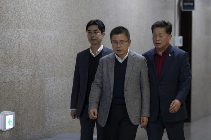 자유한국당 황교안 대표(가운데)가 8일 오전 서울 여의도 국회에서 열린 한국당 민부론 후속입법 세미나에 참석하기 위해 이동하고 있다.