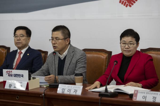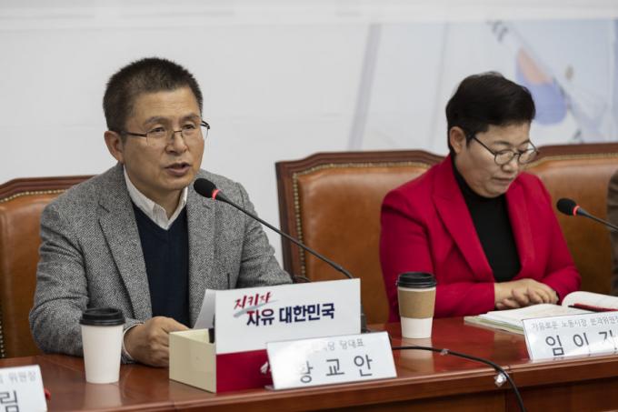자유한국당 황교안 대표(왼쪽)가 8일 오전 서울 여의도 국회에서 열린 한국당 민부론 후속입법 세미나에 참석해 발언하고 있다.