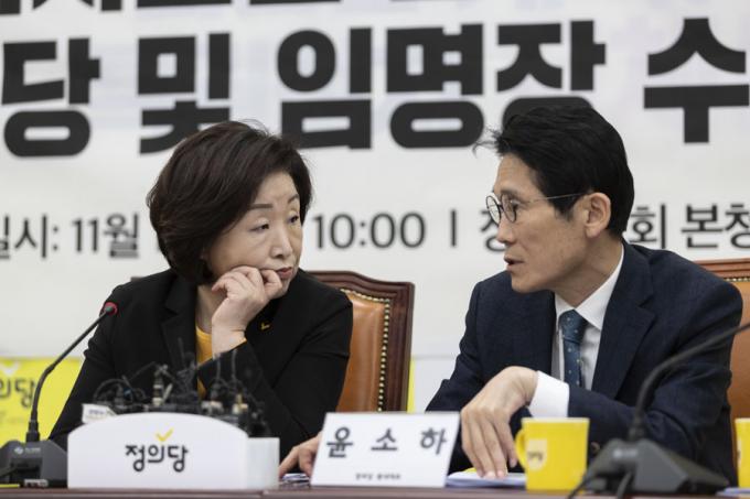정의당 심상정 대표(왼쪽)와 윤소하 원내대표가 11일 오전 서울 여의도 국회에서 열린 이자스민 전 의원 입당식에 참석해 대화하고 있다.