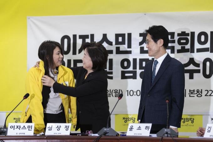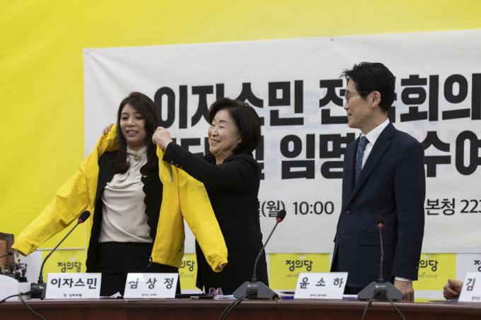 정의당 심상정 대표(가운데)가 11일 오전 서울 여의도 국회에서 열린 이자스민 전 의원 정의당 입당식에 참석해 이자스민 전 의원에게 당 점퍼를 입혀주고 있다.