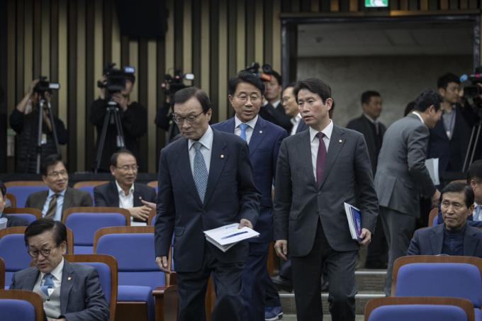 더불어민주당 이해찬 대표(왼쪽), 이인영 원내대표(오른쪽), 조정식 정책위의장이 11일 오후 서울 여의도 국회에서 열린 민주당 의원총회에 참석하고 있다.