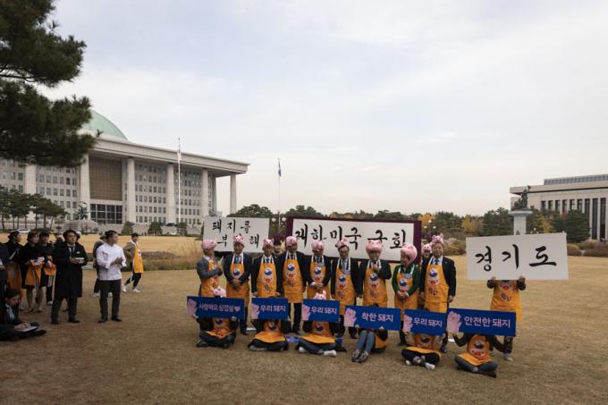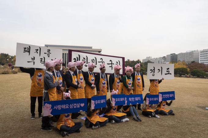 문희상 국회의장(왼쪽 일곱번째)이 12일 오후 서울 여의도 국회 의원회관 앞에서 열린 '2019 국회 우리 한돈 사랑 캠페인'에 참석해 인사말을 하고 있다.
