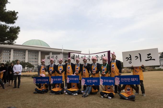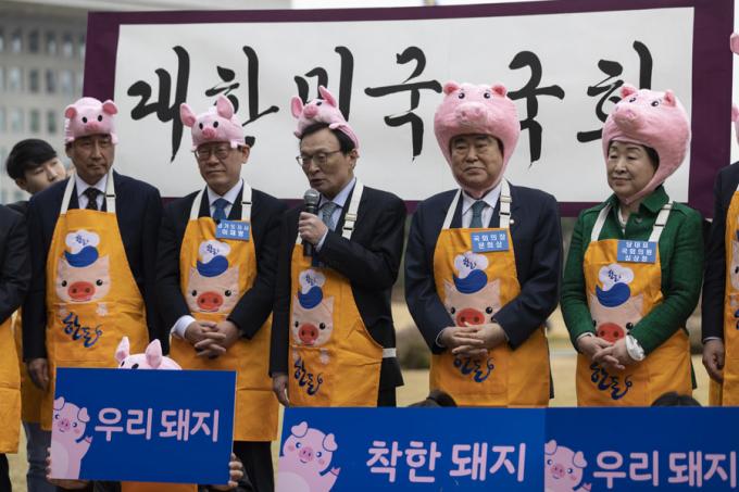 더불어민주당 이해찬 대표(가운데)가 12일 오후 서울 여의도 국회 의원회관 앞에서 열린 '2019 국회 우리 한돈 사랑 캠페인'에 참석해 인사말을 하고 있다. 왼쪽부터 더불어민주당 이종걸 의원, 이재명 경기도지사, 이해찬 대표, 문희상 국회의장, 정의당 심상정 대표.