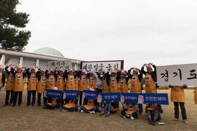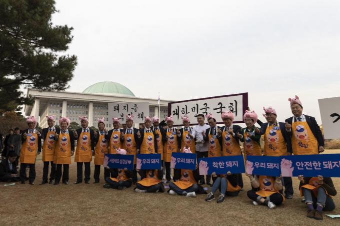 문희상 국회의장, 더불어민주당 이해찬 대표, 정의당 심상정 대표, 이재명 경기도지사와 경기도지역 의원들이 12일 오후 서울 여의도 국회 의원회관 앞에서 열린 '2019 국회 우리 한돈 사랑 캠페인'에 참석해 기념촬영을 하고 있다.