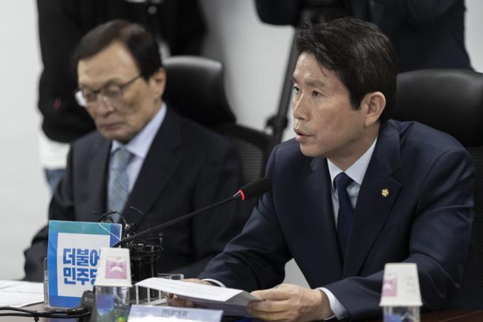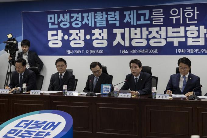 더불어민주당 이인영 원내대표(왼쪽 네번째)가 12일 오후 서울 여의도 국회 의원회관에서 열린 민생경제활력 제고를 위한 당-정-청-지방정부 합동회의에 참석해 발언하고 있다.