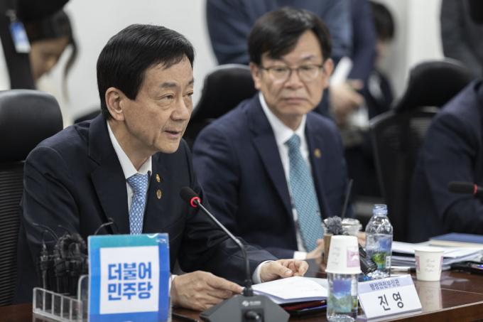 진영 행정안전부 장관(왼쪽)이 12일 오후 서울 여의도 국회 의원회관에서 열린 민생경제활력 제고를 위한 당-정-청-지방정부 합동회의에 참석해 발언하고 있다.