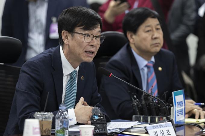 김상조 청와대 정책실장(왼쪽)이 12일 오후 서울 여의도 국회 의원회관에서 열린 민생경제활력 제고를 위한 당-정-청-지방정부 합동회의에 참석해 발언하고 있다.