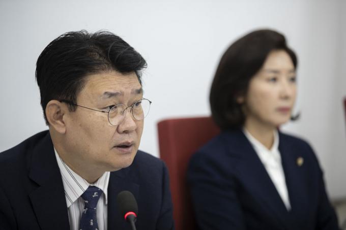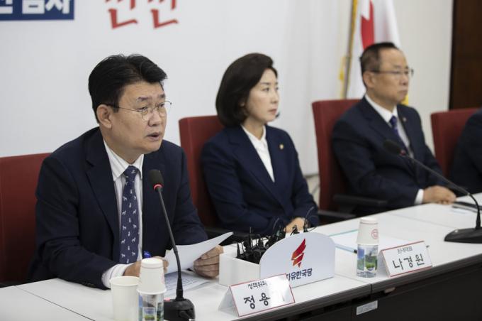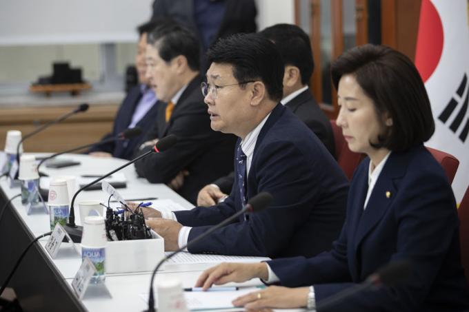 자유한국당 정용기 정책위의장(왼쪽)이 13일 오전 서울 여의도 국회에서 열린 한국당 원내대표-중진의원 회의에 참석해 발언하고 있다.