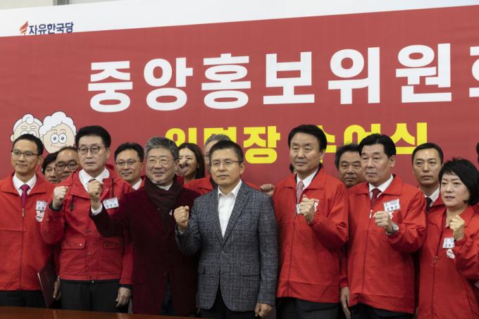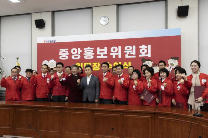 자유한국당 황교안 대표(가운데)가 13일 오전 서울 여의도 국회에서 열린 한국당 홍보위원회 임명장 수여식에 참석해 중앙홍보위원들과 기념촬영을 하고 있다.