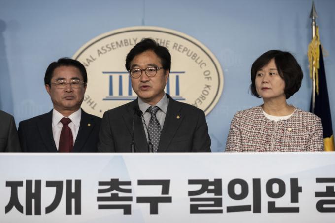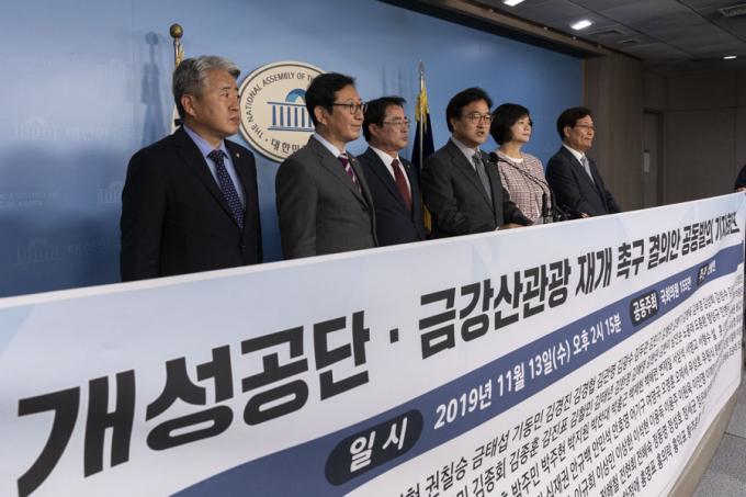 더불어민주당 우원식 의원(왼쪽 네번째)이 김한정(민주당), 최경환(대안신당),이정미(정의당) 의원 등과 함께 13일 오후 서울 여의도 국회 정론관에서 열린 개성공단·금강산관광 재개 촉구 결의안 공동발의 기자회견에 참석해 발언하고 있다.