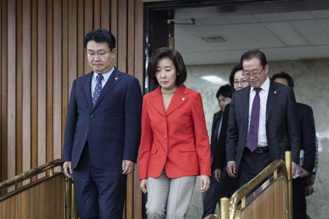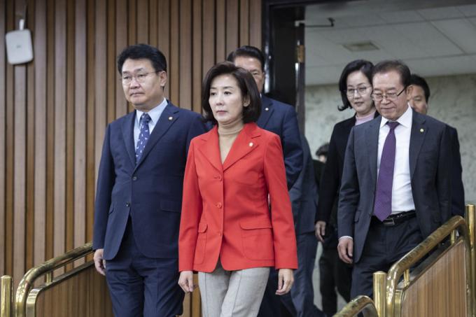 자유한국당 나경원 원내대표(가운데)가 15일 오전 서울 여의도 국회에서 열린 한국당 원내대책회의에 참석하고 있다.