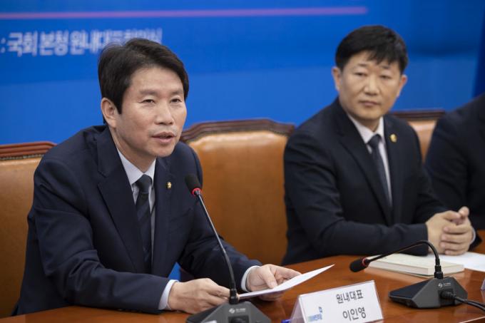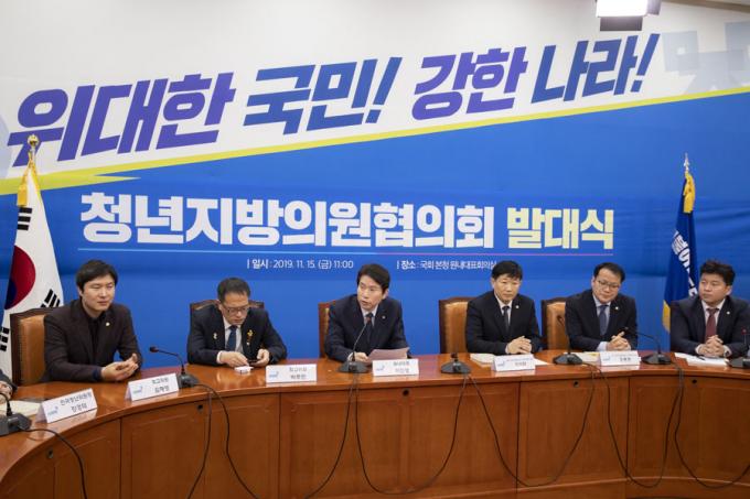 더불어민주당 이인영 원내대표(왼쪽 세번째)가 15일 오전 서울 여의도 국회에서 열린 '민주당 전국청년위원회 청년지방의원협의회 발대식'에 참석해 인사말을 하고 있다.