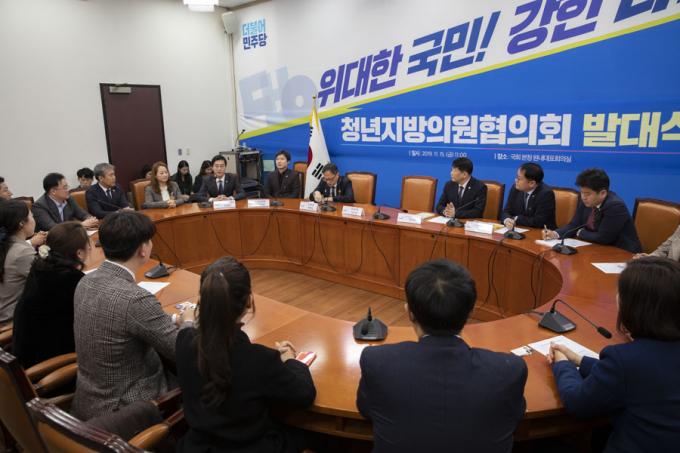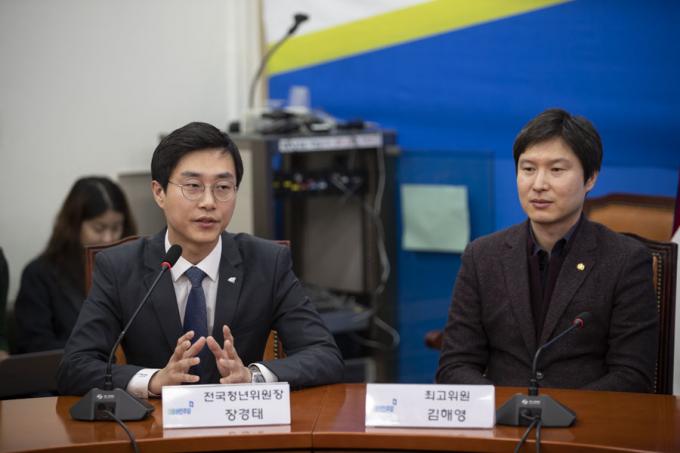 더불어민주당 장경태 전국청년위원장(왼쪽)이 15일 오전 서울 여의도 국회에서 열린 '민주당 전국청년위원회 청년지방의원협의회 발대식'에 참석해 인사말을 하고 있다.