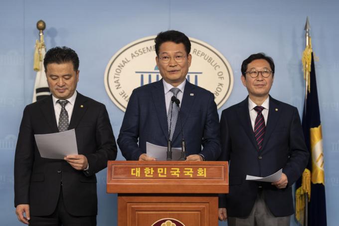 더불어민주당 송영길 의원(가운데)이 15일 오후 서울 여의도 국회 정론관에서 방위비 분담금 협상 관련 긴급 기자회견을 하고 있다.