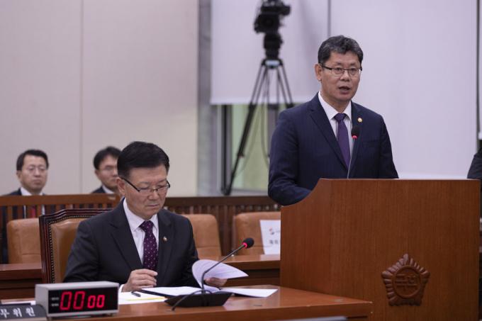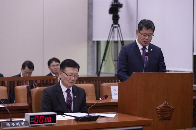 김연철 통일부 장관(오른쪽)이 15일 오후 서울 여의도 국회에서 열린 외교통일위원회 회의에 출석해 북한 선원 2명 송환 관련 긴급현안보고를 하고 있다.