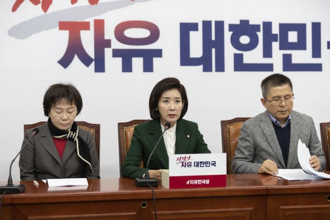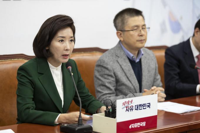 자유한국당 나경원 원내대표(가운데)가 18일 오전 서울 여의도 국회에서 열린 한국당 최고위원회의에 참석해 발언하고 있다.