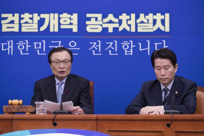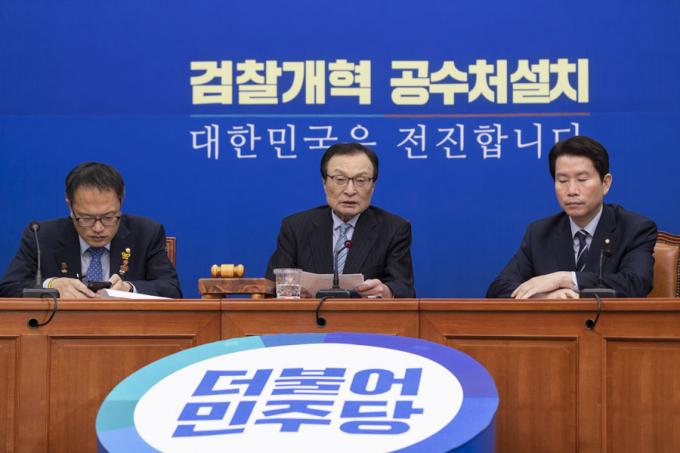 더불어민주당 이해찬 대표(왼쪽)가 18일 오전 서울 여의도 국회에서 열린 민주당 최고위원회의에 참석해 발언하고 있다.