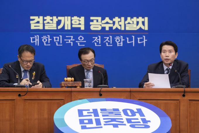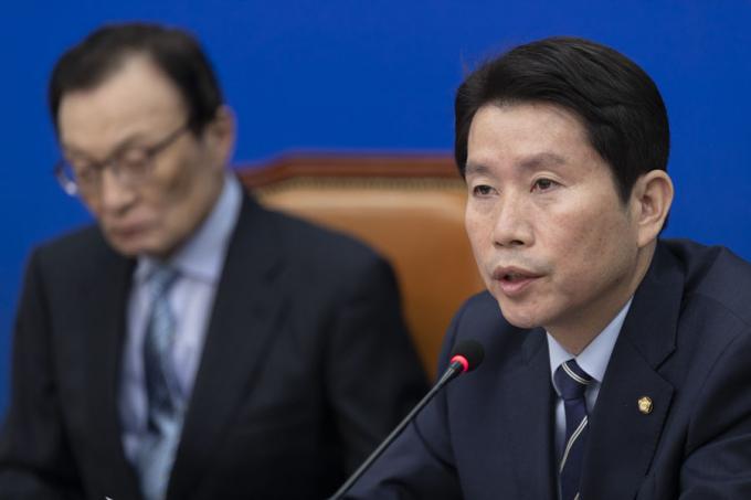 더불어민주당 이인영 원내대표(오른쪽)가 18일 오전 서울 여의도 국회에서 열린 민주당 최고위원회의에 참석해 발언하고 있다.