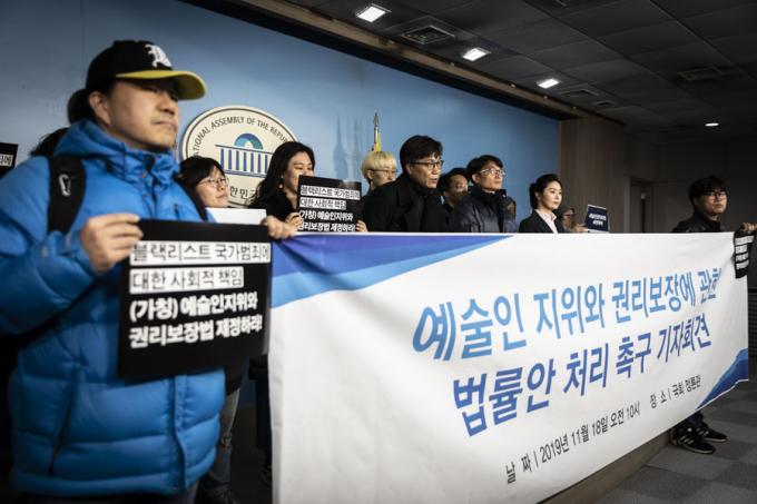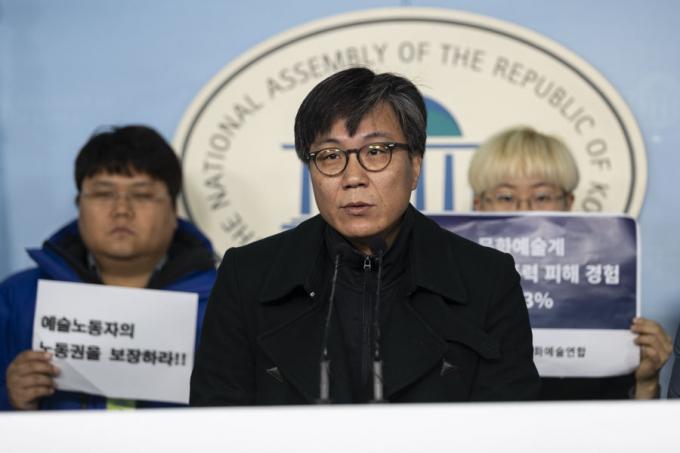 이동민 문화민주주의실천연대 공동운영 위원장이 18일 오전 서울 여의도 국회 정론관에서 '예술인 지위와 권리보장에 관한 법률안 처리 촉구 기자회견'을 하고 있다.