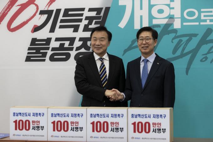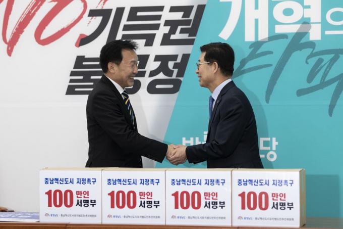 바른미래당 손학규 대표(왼쪽)가 18일 오후 서울 여의도 국회 당대표 회의실에서 충남혁신도시 지정을 촉구하는 100만인 서명부를 전달한 양승조 충남도지사와 악수하고 있다.