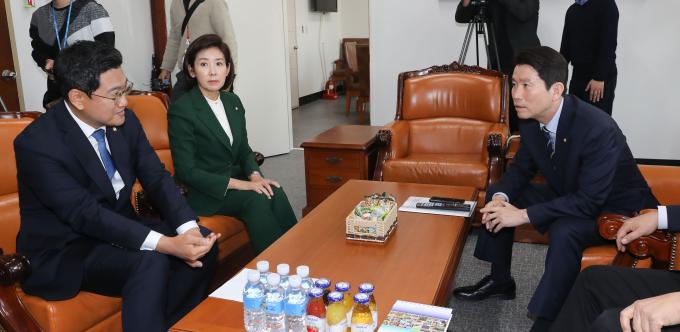 여야3당 교섭단체 원내대표가 18일 오전 서울 여의도 국회에서 패스트트랙 처리 방안과 민생입법 등 현안에 대해 논의하기 위해 정례 회동을 하고 있다. 왼쪽부터 바른미래당 오신환 원내대표, 자유한국당 나경원 원내대표, 더불어민주당 이인영 원내대표.