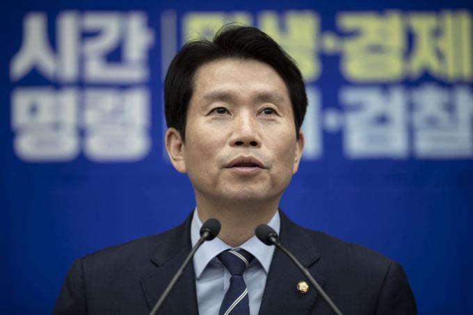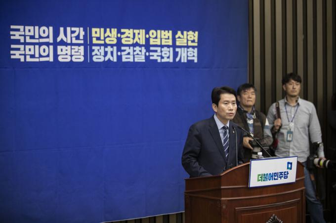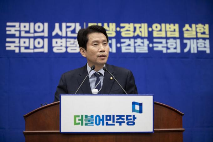더불어민주당 이인영 원내대표가 18일 오후 서울 여의도 국회에서 열린 민주당 의원총회에 참석해 발언하고 있다.