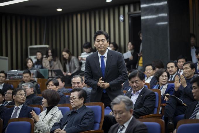 더불어민주당에 입당한 손금주 의원이 18일 오후 서울 여의도 국회에서 열린 민주당 의원총회에 참석해 인사하고 있다.