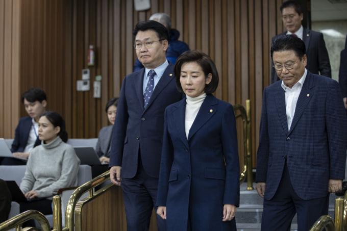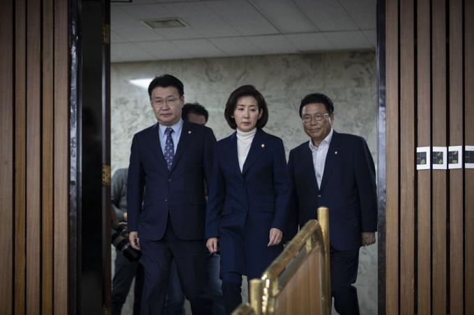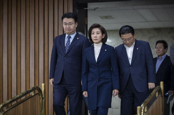 자유한국당 나경원 원내대표(가운데)가 19일 오전 서울 여의도 국회에서 열린 한국당 원내대책회의에 참석하고 있다.
