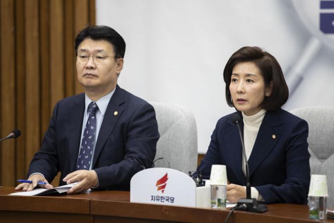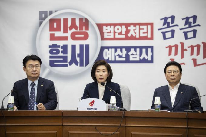 자유한국당 나경원 원내대표(오른쪽)가 19일 오전 서울 여의도 국회에서 열린 한국당 원내대책회의에 참석해 발언하고 있다.