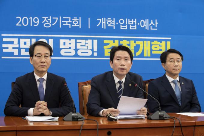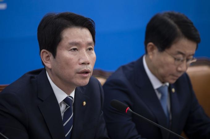더불어민주당 이인영 원내대표(왼쪽)가 19일 오전 서울 여의도 국회에서 열린 민주당 원내대표단-상임위간사단 연석회의에 참석해 발언하고 있다.