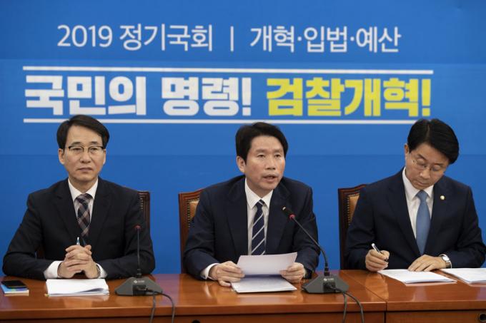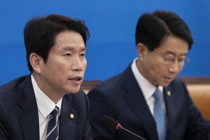 더불어민주당 이인영 원내대표(가운데)가 26일 오전 서울 여의도 국회에서 열린 민주당 원내대책회의-상임위 간사단 연석회의에 참석해 발언하고 있다.