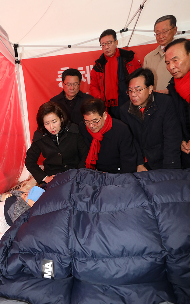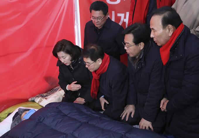 26일 오전 서울 종로구 청와대 사랑채 앞 단식농성 천막에서 7일째 단식중인 황교안 자유한국당 대표를 찾은 나경원 원내대표를 비롯한 한국당 의원들이 황 대표와 대화를 하고 있다.