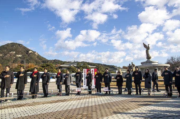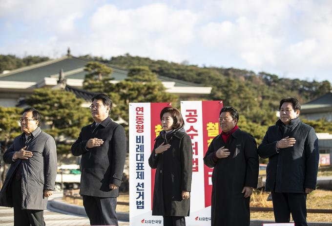 자유한국당 나경원 원내대표와 한국당 의원들이 26일 청와대 분수대 앞에서 열린 원내대책회의에서 국민의례를 하고 있다.