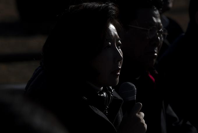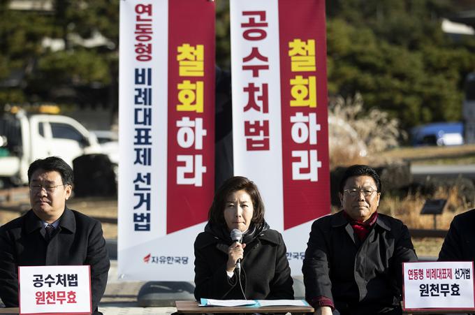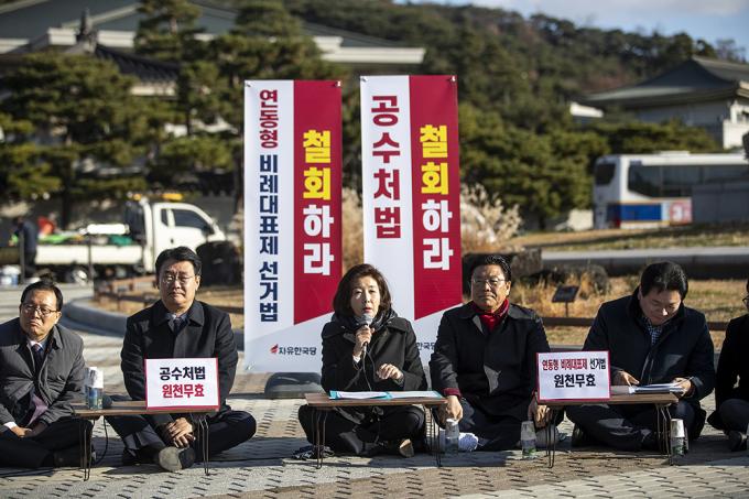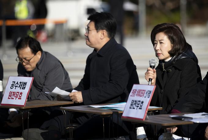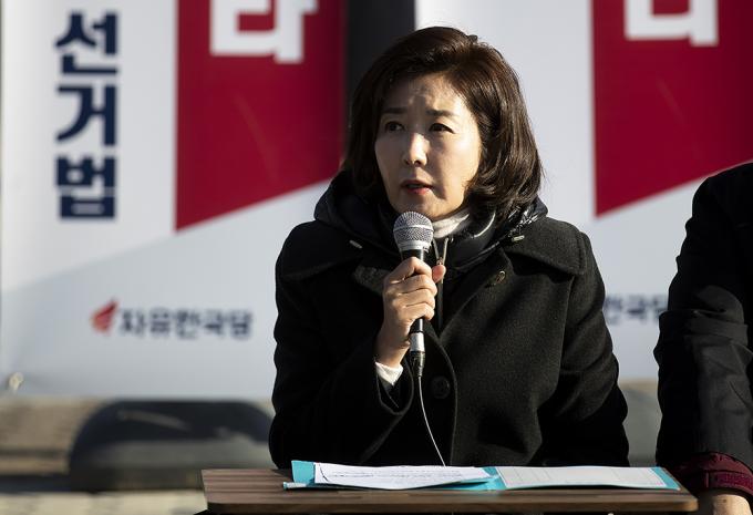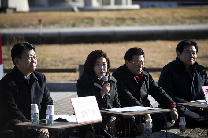자유한국당 나경원 원내대표가 26일 청와대 분수대 앞에서 열린 원내대책회의에서 모두발언을 하고 있다.