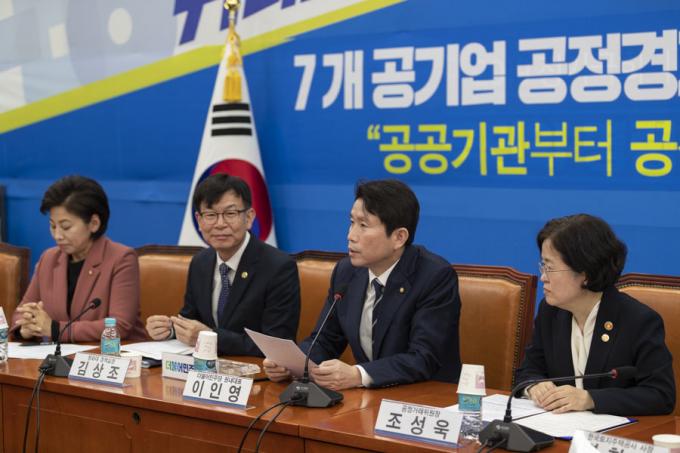 더불어민주당 이인영 원내대표(가운데)가 26일 오전 서울 여의도 국회에서 열린 '7대 공기업 공정경제 정착 및 확산을 위한 협약식'에 참석해 발언하고 있다.