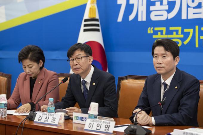 김상조 청와대 정책실장(오른쪽)이 26일 오전 서울 여의도 국회에서 열린 '7대 공기업 공정경제 정착 및 확산을 위한 협약식'에 참석해 발언하고 있다.