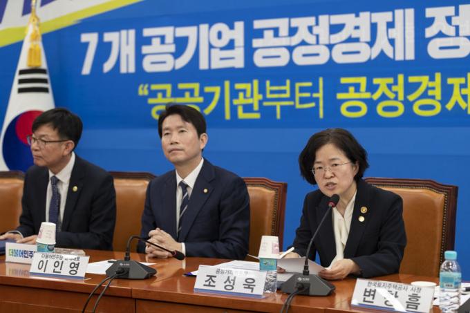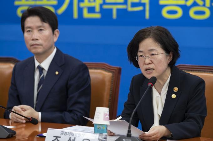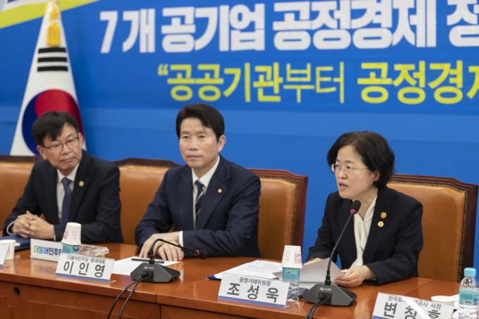 조성욱 공정거래위원장(오른쪽)이 26일 오전 서울 여의도 국회에서 열린 '7대 공기업 공정경제 정착 및 확산을 위한 협약식'에 참석해 발언하고 있다.