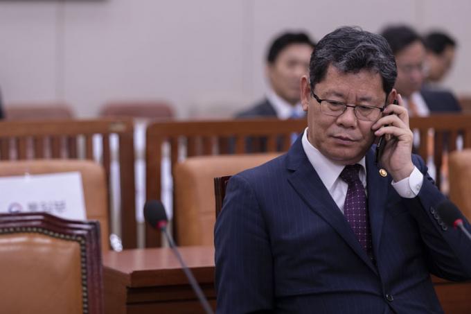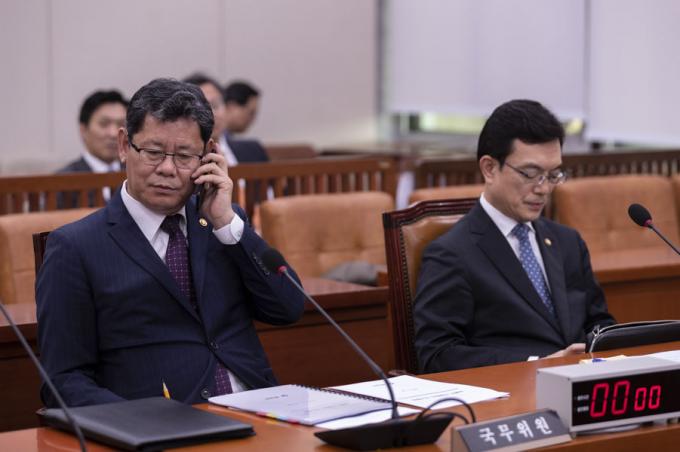 김연철 통일부 장관(왼쪽)이 26일 오후 서울 여의도 국회에서 열린 외교통일위원회 전체회의에 출석해 전화를 받고 있다.