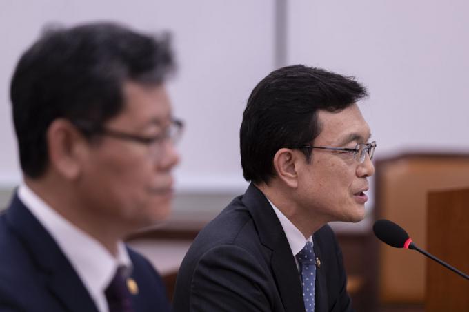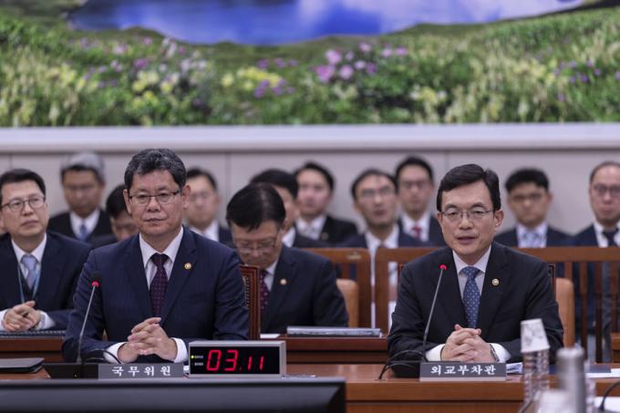 조세영 외교부 제1차관(오른쪽)이 26일 오후 서울 여의도 국회에서 열린 외교통일위원회 전체회의에 출석해 지소미아 관련 질의에 답하고 있다. 이날 강경화 외교부 장관은 한-아세안 특별정상회의 참석으로 불출석 했다.