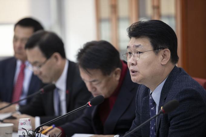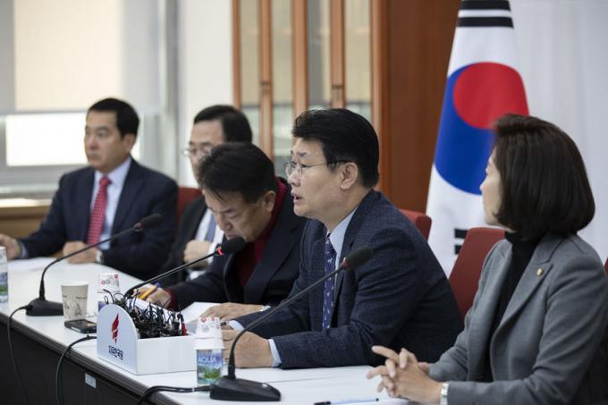 자유한국당 정용기 정책위의장(오른쪽)가 27일 오전 서울 여의도 국회에서 열린 한국당 원내대표-중진의원 회의에 참석해 발언하고 있다.