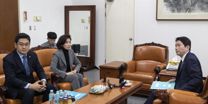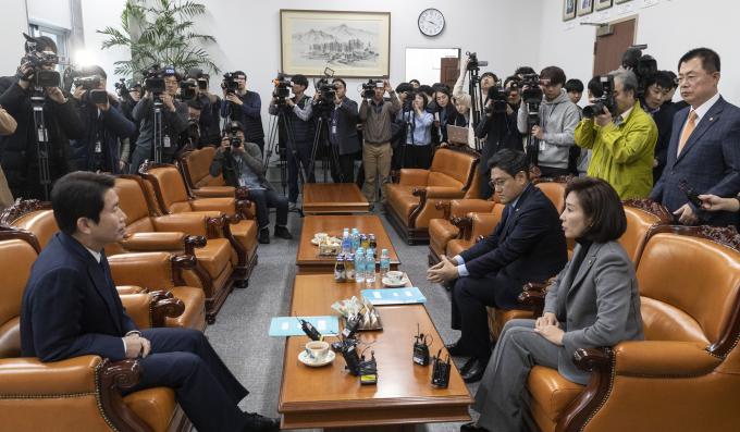 더불어민주당 이인영 원내대표(왼쪽부터), 자유한국당 나경원 원내대표, 바른미래당 오신환 원내대표가 26일 오후 서울 여의도 국회 운영위원장실에서 여·야 3당 교섭단체 원내대표 회동을 하고 있다.
