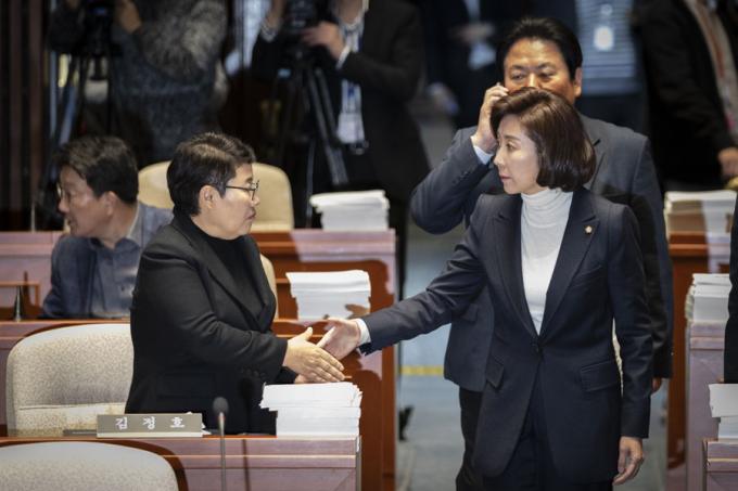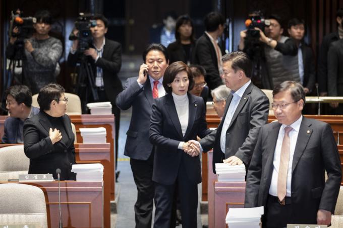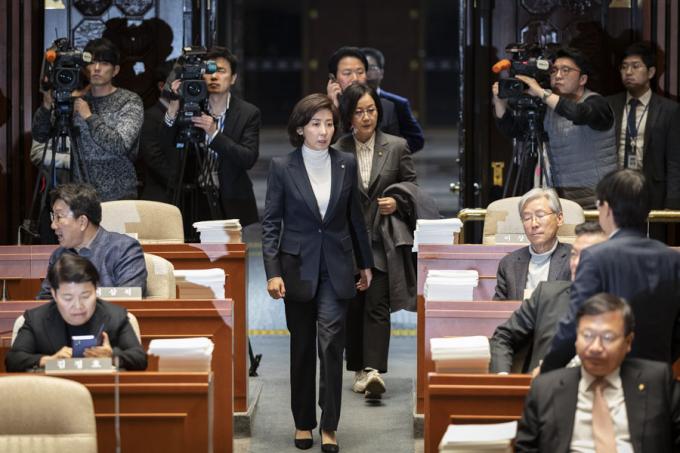 자유한국당 나경원 원내대표가 28일 오전 서울 여의도 국회에서 열린 한국당 긴급 의원총회에 참석하고 있다.