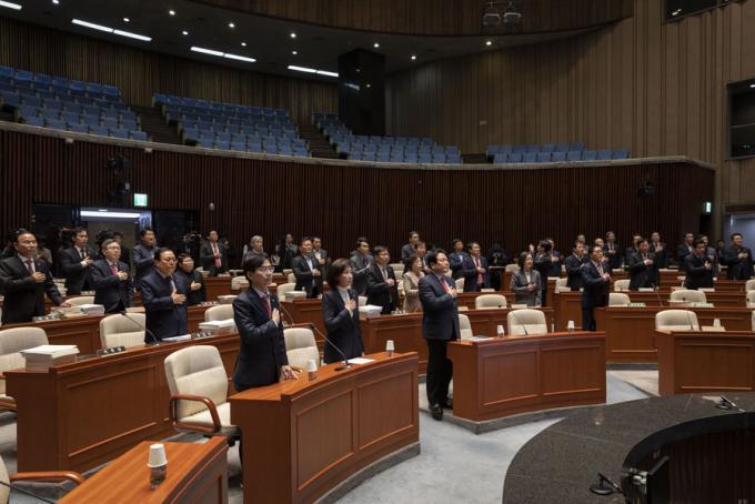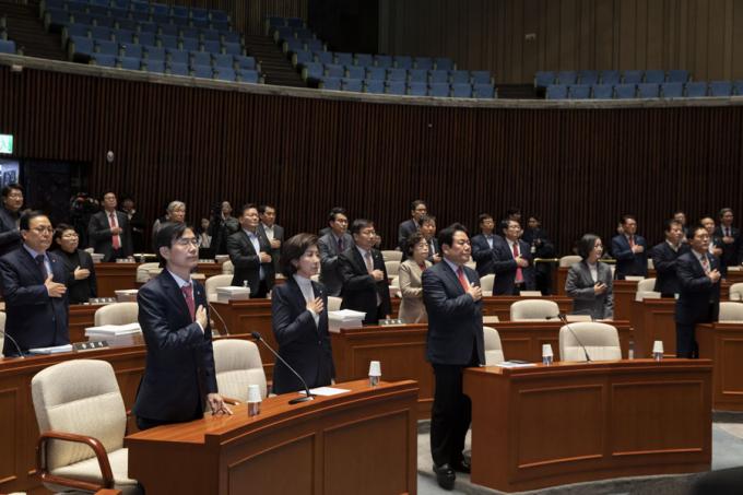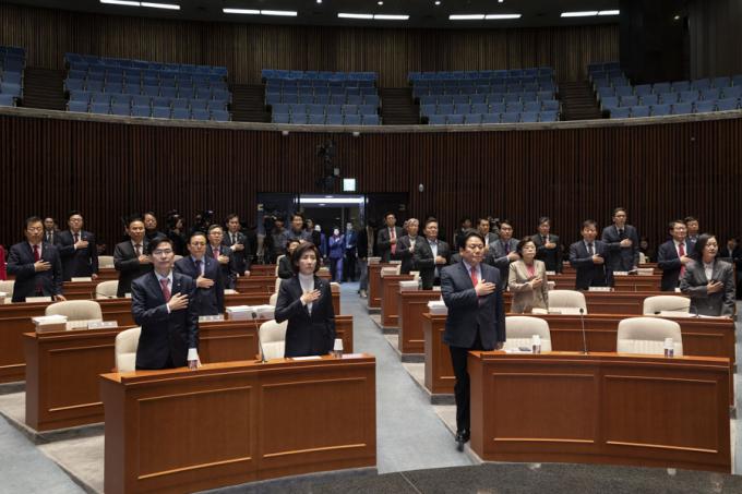 자유한국당 나경원 원내대표를 비롯한 한국당 의원들이 28일 오전 서울 여의도 국회에서 열린 한국당 긴급 의원총회에 참석해 국민의례를 하고 있다.